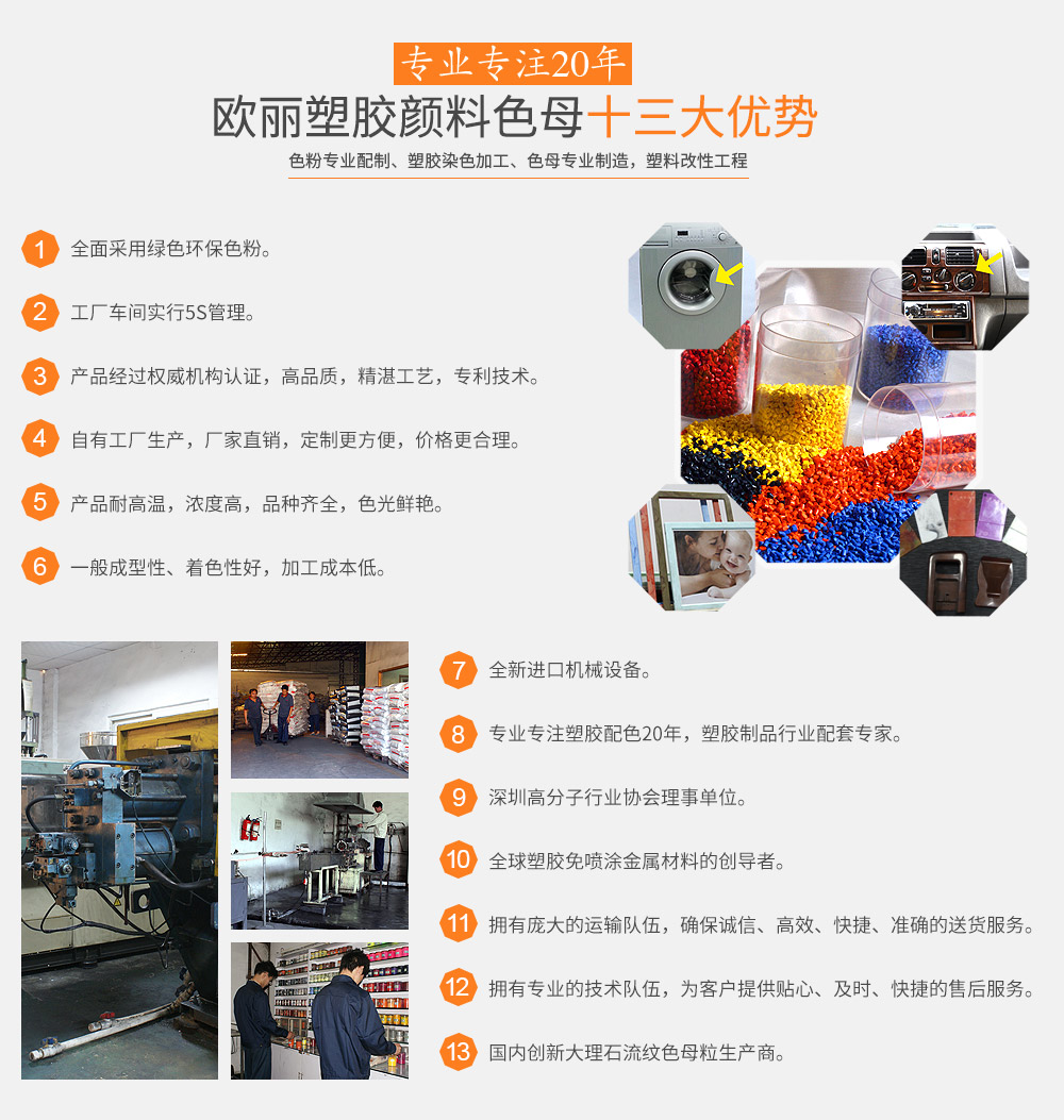 “深圳市歐麗塑膠原材料有限公司”創(chuàng)辦于上世紀(jì)90年代初,經(jīng)過(guò)20多年的不斷發(fā)展壯大,已經(jīng)成為色母粒、色母料、黑色母粒等塑料色母粒領(lǐng)先的色母粒廠家,更是塑膠制品行業(yè)的報(bào)務(wù)精英。